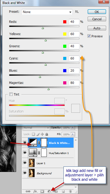 Klik add New Fill or adjustment layer > pilih hue/saturation